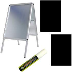 Daher findet man ebenso Plakatständer, die durch eine Folie geschützt sind. Wahlweise kann man hier vorgedruckte Plakate einlegen, oder eine Folie, die man ebenso leicht beschriften kann, wie eine Kreidetafel.
